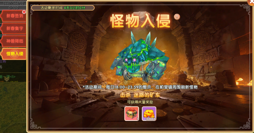 击败入侵怪物可获得节日宝箱和金币奖励,每人每日最多可以获得10次奖励。